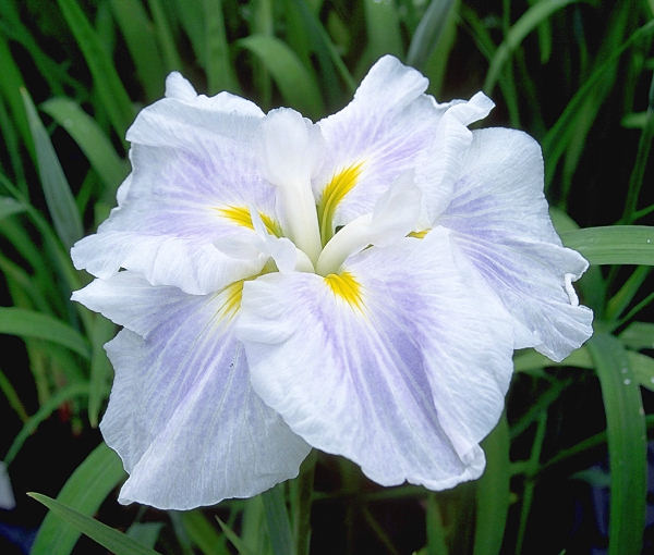 江戸系 早生 白地に青がすりの平咲き六英大輪。花径はおよそ18cm程度の大輪。