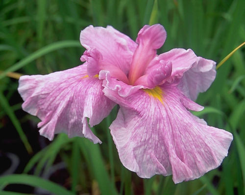 肥後系 中 桃色地に白絞りの入る三英。花径約18cm程度の中大輪。草丈は低く鉢では40cmほど