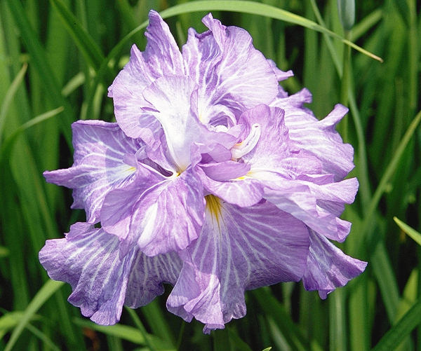雲井竜 くもいりゅう KUMOIRYU 江戸系 中生 明るい紫地に白筋入りの八重狂い咲き、花径18cmを越す大輪から極大輪。 草丈は100cm程度。性質は丈夫で、繁殖も良い。 「宇宙」と「雪千鳥」との交配にもう一度「雪千鳥」をかけたもの。 美しい花だが花首が弱く、風雨にあたるとすぐ首から垂れてしまうのが欠点。 1993年、加茂花菖蒲園作