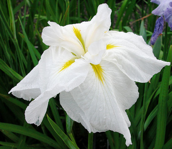 雲の駆波 くものかけなみ KUMO NO KAKENAMI 肥後系 晩生 純白の六英花。花径は18cm程度の巨大輪。 草丈はおよそ60cm前後。性質は丈夫で繁殖は普通。 西田衆芳園の西田幾氏の作で、衆芳園のカタログでは優秀花とあった。実際、よく整った 美しい花で、伝統的な熊本花菖蒲の流れを伝えるものだった。 画像の花はあまり良い花ではない。もっと花形良く美しく咲く。