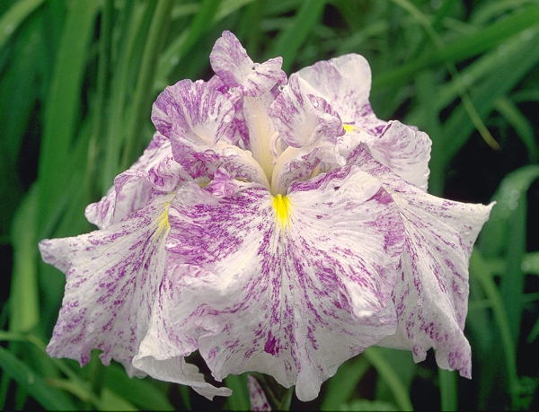 旭 匠 きょくしょう KYOKUSHO 肥後系 白地に紅紫の散り絞り六英。花径は18cm程度の大輪。 性質、繁殖は弱い。 作者は西口正二氏で、氏は三重県に住み、光田義男氏の作花をもとに、主に肥 後系の品種を改良された。氏の作品は三重花菖蒲会で保存されているが、一般 には普及していないと思われる。