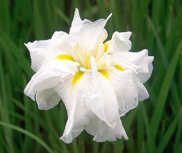 満月の恋 まんげつのこい MANGETSU NO KOI 肥後系 純白色の八重咲き。花径は約18cm程度の大輪から極大輪。 「満月の宴」より当園では性質が弱いようで、上の写真しか撮影していないが、 光田氏のカタログには12弁咲きとある。 1994年、光田義男氏作