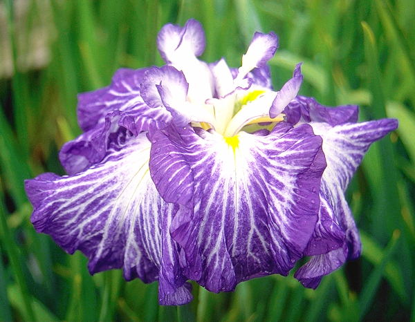満艦飾 まんかんしょく MANKANSHOKU 肥後系 濃るり色に鮮明な太筋が弁先まで入る六英。花径は18cm前後の大輪から極大輪。 肥後系本来の品格の高い正花の花形を持つ。草丈は約50cm前後で低い。「舞 扇」ののびやかな 美しさとは違い、どこか古風なというか、老練さを感じさせる花である。 1969〜71年頃、光田義男氏作。