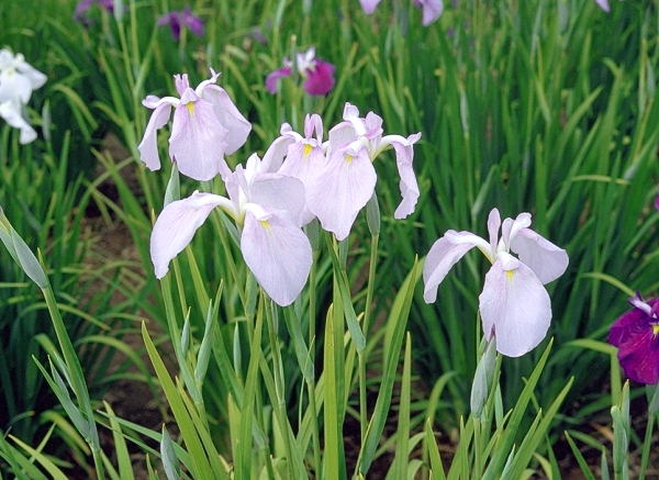 三淵の流 みふちのながれ MIFUCHI NO NAGARE 長井古種 早生 ごく薄い藤桃色の三英花。花径はおよそ10cm程度の小中輪。 草丈は高く100cmを超え、葉も細めで、全体としてノハナショウブの趣を感じさせる。 長井古種の中では普及している品種である。