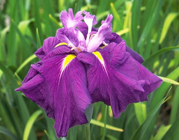 紅葉狩 もみじがり MOMIJIGARI 肥後系 中晩生 赤紫の六英花。花径は20cmを越す極大輪。花弁が大きくゆったりと垂れる、こういう花形を 「深咲き」と言う。芯は大きく、蕊片が毛羽立つのが特徴。草丈は100cmを超える。豪華な花の割には性質は丈夫 である。 1969年、加茂元照氏作