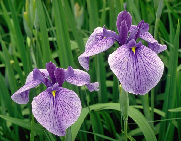 村 祭 むらまつり MURA MATSURI 長井系 中生 薄紫地に紫の脈が入る三英花。花径はおよそ9cm程度の小輪。 草丈は高く100cmを越える。性質は丈夫で繁殖も良い。 加茂花菖蒲園が1988年に作出した品種。長井古種らしい花形とどこか古風な色彩を持つ花。 花菖蒲園で群れて咲いた姿も美しく、また茶花など切花として見た場合にも十分使える良い花である。