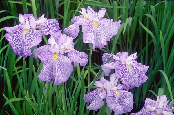 武者扇 むしゃおうぎ MUSHA OGI 江戸系 中生 紫地に白筋が密に入る三英花。花径はおよそ15cm程度の中輪。 草丈は70cm程度。性質はやや弱く、繁殖は普通。 肥後系の「舞扇」と江戸系の「扇の的」の交配によって作出された品種。細い筋が密に入り、 たいへん美しい品種。 1987年、加茂花菖蒲園作