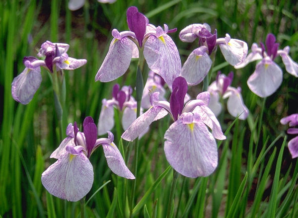 長井 日月 じつげつ JITSUGETSU 長井古種 白地に紅かすりと砂子が入り、鉾は紅紫色となる三英花。花径はおよそ7cm程度の小輪。 草丈は60cm程度。 長井市あやめ公園にて、日月として植栽されている品種。当園に保存される日月とは個体が異なり、画像のように、 比較的白っぽい花弁を持つものから、もっと紅がすりが多く入り、紅っぽい花弁になっているものまである。 やさしい花容の美しい花である。