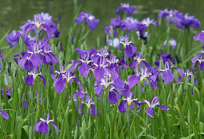 長井山紫水明 ながいさんしすいめい NAGAI SANSHISUIMEI 長井系 中生 写真は早朝撮影のため本来の色が出ていないが、花色は紫色に白筋の入る三英。 花の直径10cm程度の小輪、草丈は100cm程度。 野生味を残した素朴な、しかし品のある花形で、改良品種とはまた違う美しさがある。 長井より無名の古種を採集し、当園で名前を付けたもの。