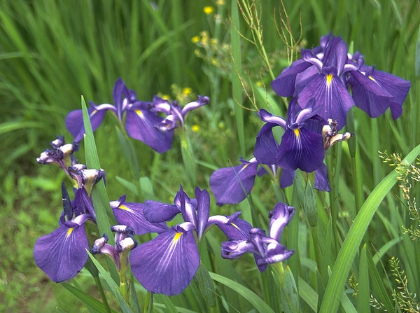 無名の長井古種のひとつ 長井市の休耕田で栽培されていた長井古種を撮影したもの。 この花は実際にはそうでないと思うが、こういう花を見ていると、野生のノハナショウブが、 ほんの少し変化した花のように感じられ、花菖蒲が発達した過程を見ているような気がして くる。室町から江戸時代のはじめ頃、こんな花が山野から見つけ出されて栽培されたのが いまの花菖蒲のはじまりなのだと思う。