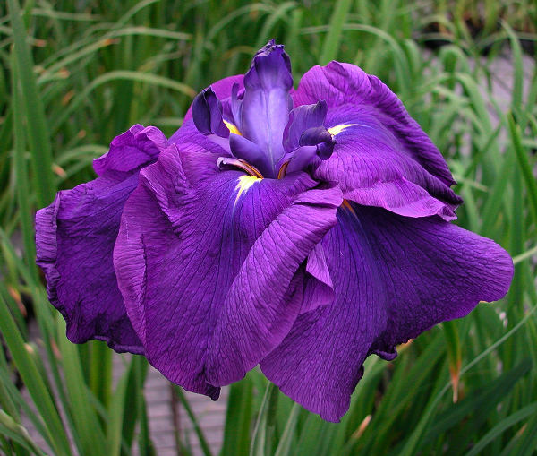 肥後系 晩生 濃いルリ紫の六英花。花径はおよそ18cmを越す極大輪。
