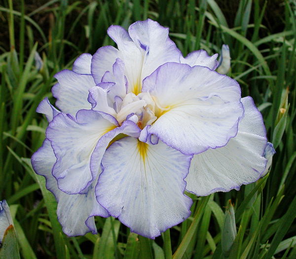 肥後系 白地に薄青のかすりがわずかに入り、鮮明な青覆輪が入る八重。花の直径は20cm程度の大きな花。草丈は100cm程度。性質、繁殖は普通。