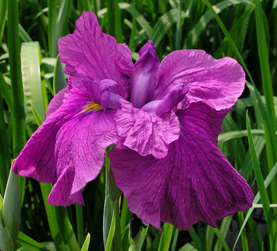 肥後系 晩生 濃紅の三英大輪。弁の重なり良く整った名花。花径はおよそ15cmほど。