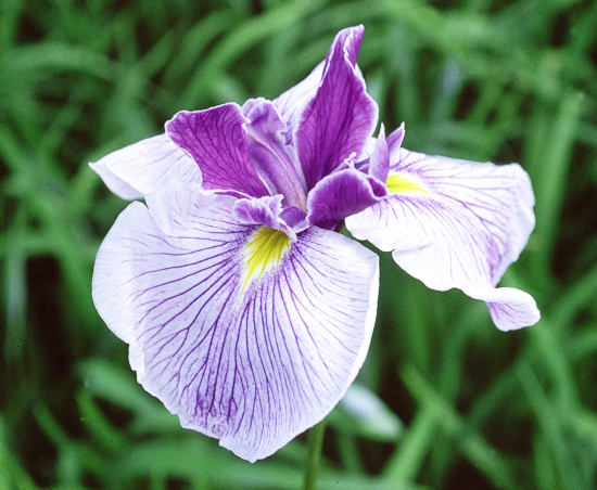 追 風 おいかぜ OIKAZE 江戸系 早生 白地に紫の砂子が少し入り、そこに紫脈が入る。鉾は紅紫に白糸覆輪の三英花。 花径はおよそ16cmほどの中輪。草丈は100cmを越す。性質は普通。繁殖はやや少ない。 1970年に牧野善作氏が作出した品種。いわゆる平尾牧野系の品種の一つ。選抜は平尾先生と思われる。 草丈が高く、群生がたいへん美しく、シーズン序盤の花菖蒲園を彩る代表的な品種。 群生の写真をまた掲載したいと思う。