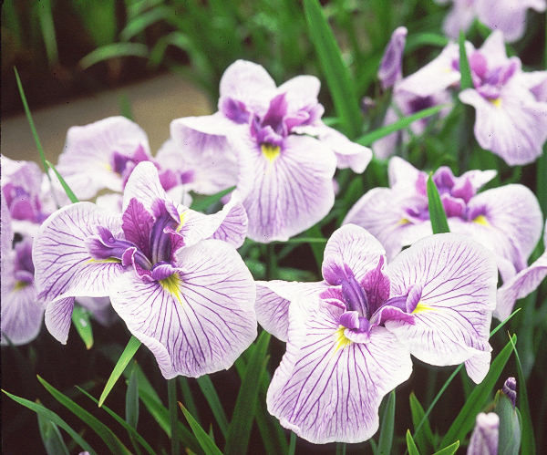 晩加茂万里 おくかもばんり OKU KAMO BANRI 江戸系 晩生 白地に赤紫の脈が入り、鉾は赤紫、芯はやや濃い紫となる三英花。 花径はおよそ13cm程度の中輪。草丈は約70cm程度。性質は丈夫、繁殖も良い。 当園園主の加茂元照氏の作だそうだが、いつ頃のものかは不明。厚い花弁のしっかりと咲く花で、 この花が咲き出すと、いよいよ今年のシーズンも終わりだなあと感じる晩咲きの江戸花菖蒲である。 花形も整っており、小気味良い樋弁をもっている。