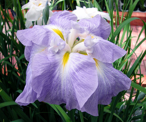 御前崎 おまえざき OMAEZAKI 江戸系 中生 明るいブルーを感じる藤色に底白の六英花。花径は20cmに迫る巨大輪。 草丈も高く100cmを越す。性質は普通だが繁殖がやや弱い。 やや平咲きに近く、大らかな花容を持つことから、地元遠州の名勝「御前崎」の名を付けた。 2003年 加茂花菖蒲園作