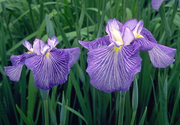 扇の的 おうぎのまと OGI NO MATO 江戸系 中晩生 明るい青紫に鮮明な白筋の入る三英花。花径はおよそ13cm程度の中輪。 草丈は70cm前後。性質、繁殖とも普通。 加茂花菖蒲園が1984年に作出した品種。