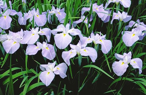 尾 瀬 おぜ OZE 江戸系 極早 ごく薄藤色で芯が白い三英。花径は8cm程度の小輪。 極早生の品種の開花時期に咲いた後、中生または晩生の品種の開花時期に 再び開花する二度咲きの性質がある。草丈は低く40cm程度。盆養に向く品種 である。1996年 加茂花菖蒲園作