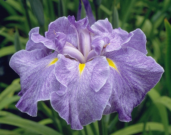 肥後系 紫の砂子絞りの六英花。花弁は大きく波打つ。