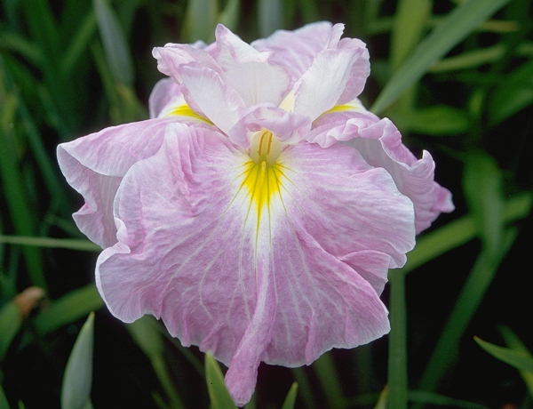 桜 舟 さくらぶね SAKURABUNE 肥後系 早生 光田氏のカタログには、「濃い桃色に白小筋、三英巨大輪樋弁深咲き」とあるが、 それほど濃いピンクでもなく、明るい薄い桃色といった感じで、品のある良花である。草丈は60cm前後。 1986年、光田義男氏作