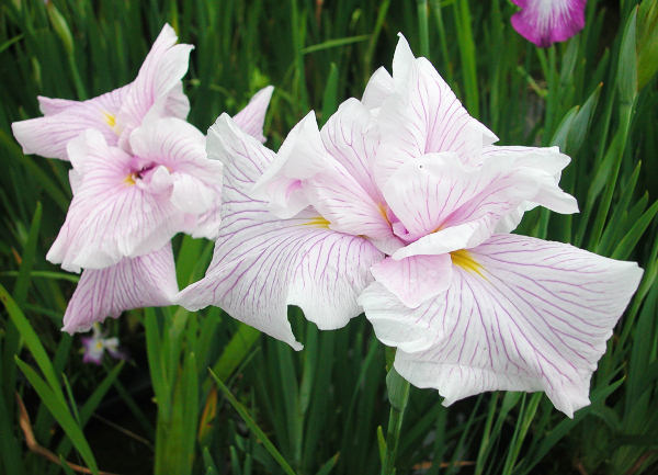 桜勝見 さくらかつみ SAKURAKATSUMI 江戸系 中晩生 薄いピンクに濃ピンクの脈が入る台咲きの変わり咲き。花径はおよそ13cm前後。 草丈は60cm内外。性質は普通。 江戸古花の「八重勝見」から台咲きの特徴を受け継いだ品種。雌蕊が弁化するめずらしい花形。 2003年、加茂花菖蒲園作