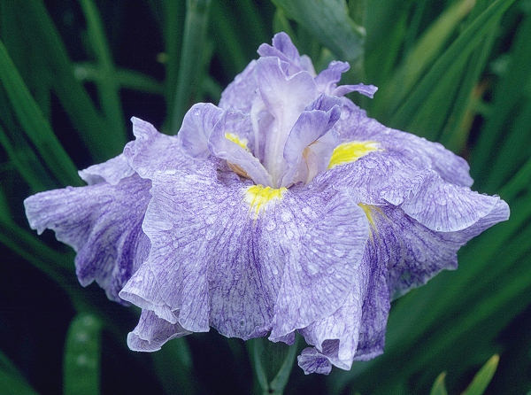 肥後系 中生 白地に青紫砂子と同色の細脈が入る六英花。花径はおよそ18cm程度の大輪。