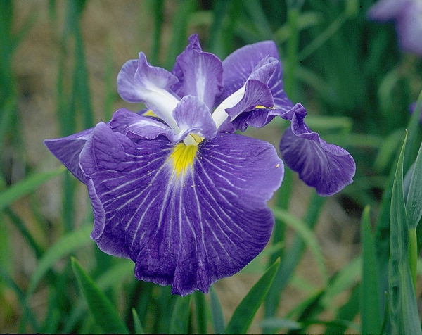 青岳城 せいがくじょう SEI GAKU JYO 江戸系 中生 澄んだ濃いオーシャンブルーに白筋の入る三英花。花径はおよそ16cmほどの中輪。 草丈はやや低く60cm程度。性質、繁殖は普通。 平尾秀一氏が1969年に、千葉県の牧野善作氏の圃場を借りて作出した品種で、「伊豆の海」、「藍草紙」、 「朝戸開」など、氏の一連のブルーの花の追及により生まれた花である。朝戸開とは姉妹株で、よく似ている。