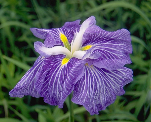 扇 寿 せんじゅ SENJYU 肥後系 晩生 紫地に白筋が鮮明に入る六英花。花径はおよそ18cm程度の大輪。 草丈は100cm前後。芯が白く美しいが、肥後系の基準からすれば少し貧弱で寝ている。 1993年、加茂花菖蒲園作。