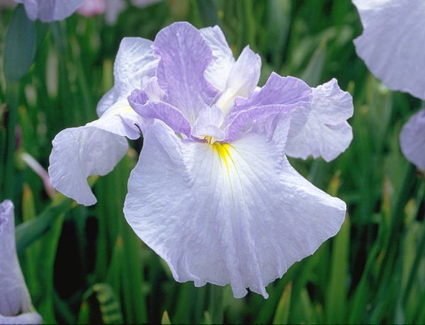 時雨西行 しぐれさいぎょう SHIGURE SAIGHOU 江戸系 中生 薄水色に白筋が少し入り、鉾はやや濃い藤紫の三英花。 花径はおよそ16cm程度の中輪。草丈は100cm前後。性質、繁殖は普通。 美しい花色と、端正な花形で気品があり、人気も高い品種である。 宮崎英雄氏の作とのことだが、作出年代は不明。