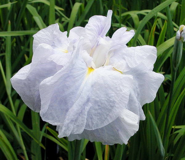 新水色獅子 しんみずいろじし SHIN MIZUIRO JISHI 肥後系 中生 極薄い水色の八重咲き。花径は18cm前後の大輪。 後藤昭三氏の「水色獅子」の水色の花色が珍しく、この花に「千鳥」かその系統の花を交配して、 さらに大輪で水色な品種をと作ったもの。ごく薄い水色の花で、他にこの花色の品種はあまり なく、めずらしい色彩と言える。草丈は100cm程度に伸び、性質も丈夫である。 1996年、加茂花菖蒲園作