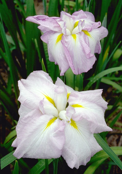 | 新袂鏡 しんたもとかがみ SHIN TOMOTO KAGAMI 江戸系 早生 白地に弁のふちが薄い藤ピンクの覆輪ぼかしになる六英花。花径はおよそ13cm程度の中輪。 吉江清朗氏が1980年に作出した品種。はじめ「早生夕陽」と命名されたが、のちに改名された。「袂鏡」によく似た花で、早咲き。 こんにちの多くのピンクが伊勢系のピンクから来ているが、この花の淡い藤色を含んだピンクは、江戸系のみから来たピンクの色である。「夕 陽」、「袂 鏡」なども同じような花色を持っている。 ただ、残念なことに、こういう淡いピンクよりも、最近は光田氏が作出した濃桃赤色のような濃いピンクの方が一般受けするので、当園ではこの品種も保存程度に少量維持しているだけである。普及はしているので多くの花菖蒲園で見ることができると思う。 |