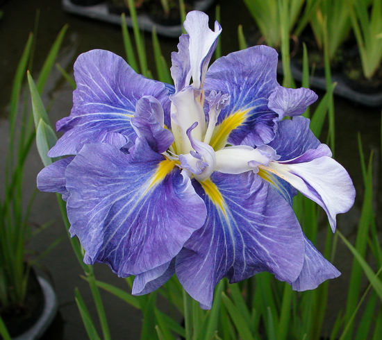 江戸系 中晩生 明るい青紫に白筋が入る半八重〜八重。花径はおよそ18cmほど。