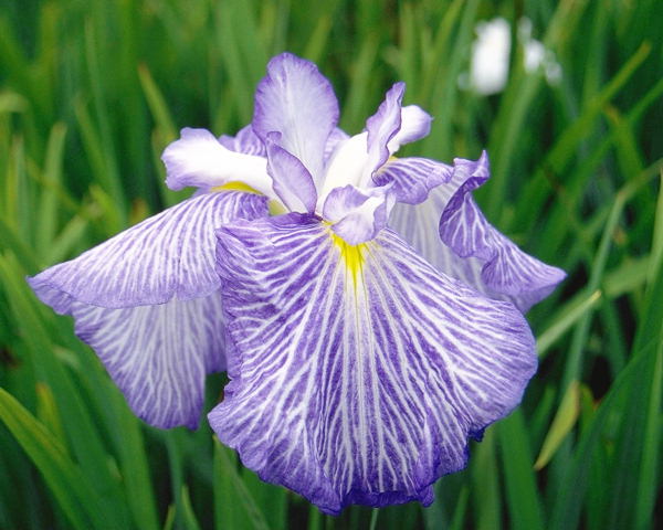 潮 流 ちょうりゅう CHORHO 江戸系 中生 青紫地に鮮明な白筋が多数入る三英花。花径はおよそ15cm前後の中輪。 さわやかな花色で性質も強く繁殖もまあまあ殖える良い品種である。 1996年、加茂花菖蒲園作