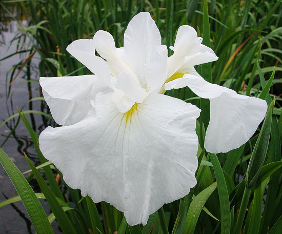 白 州 しらす SHIRASU 江戸系 中晩生 花形のよく整った純白の三英花。花径はおよそ15cmほどの中輪。 草丈は60cm前後。性質、繁殖は普通。 花形がよく整い、端正な印象を受ける純白の花。肥後系とするには垢抜けた感じがしたので、 江戸系に入れた。 2003年加茂花菖蒲園作