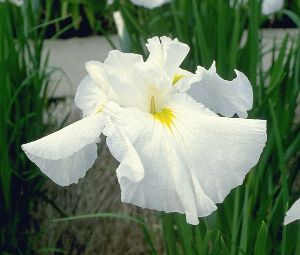 白 露 しらつゆ SHIRA TSUYU 肥後系 中生 純白の三英花。花径は18cm程度の大輪。 草丈はやや低く60cm程度。性質は丈夫で繁殖も良い。 当園園主の加茂元照氏が、1980年に作出下品種。「宝 船」、「清 鶴」などとともに、 純白三英花のスタンダードな品種の一つ。3種ともよく似ている。よく普及している花菖蒲 園向きの実用品種でもある。