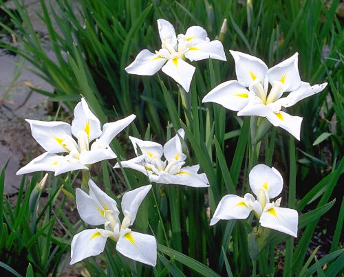 五三白 ごさんはく GOSANHAKU 江戸系 白花で、三英、四英、五英、六英に咲き分ける。花径13cm程度の小輪。草丈も40cm前後と低く 盆養に向く。北海道農業殿門学校講師の石山貞吉氏が、1968年に作出した品種。