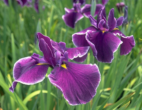 白い虹 しろいにじ SHIROI NIJI 江戸系 早生 やや紅がかるビロード紫に白糸覆輪が入る三英花。花径はおよそ14cm程度の中輪。 草丈は60cm程度。性質、繁殖は普通。 紫に白覆輪の入る系統は、リゾクトニア性の立ち枯れ病に弱いため栽培が厄介になってしまったが、 その中でもこの品種は病菌に対して耐性があるのか、比較的作りやすい品種である。 1995年、加茂花菖蒲園作