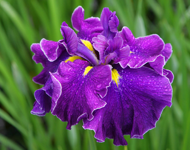 1997年 加茂花菖蒲園作。発表以来多くの方から要望のあった品種。紫に糸覆輪系では今のところ