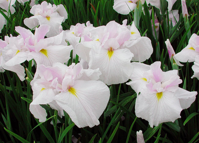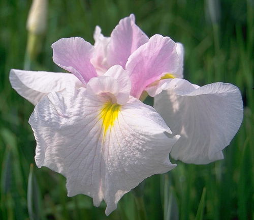平尾秀一氏の「清少納言」の実生で、親と草姿や花形がよく似ている。平尾先生が作られた江戸系の品種は、みなその花形という点では似ており、肥後系の三英を簡略化したような、品のある花形であることが多い。例えば「栄 紫」にしても「清少納言」にしても、「千代の春」にしても、どことなく肥後系の花形を意識されていたように感じるのである。この「翠 映」もそんな花形を継承している。現代の花菖蒲の、基本的な花形の一つだと思う。また、この品種は性質も丈夫で繁殖も良く、花菖蒲園でも十分使えまた品があり美しいので、多くの方からお褒めの言葉を頂いている。私はこれ一つあればいいや。と常々思っている。