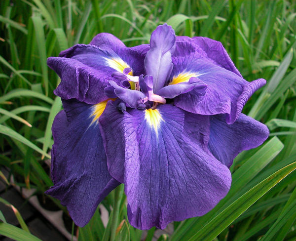 水前寺 すいぜんじ SUIZENJI 肥後系 晩生 ルリ紫の六英花。花径は18cmほどの大輪。 草丈は70cm前後。性質、繁殖は普通。 1940年以前に作出されたとのことだが作者等は不明。 肥後系や熊本花菖蒲に多く見られるルリ紺色の品種。この系統は類似花が多く 札落ちになると判別が難しい。