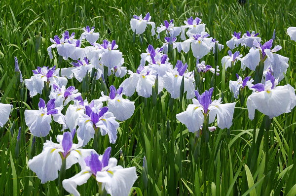 江戸系 極早生 白地に僅かに紫の絣が入り、鉾は藤青紫となる二色花。花径はおよそ14cm程度の中輪。