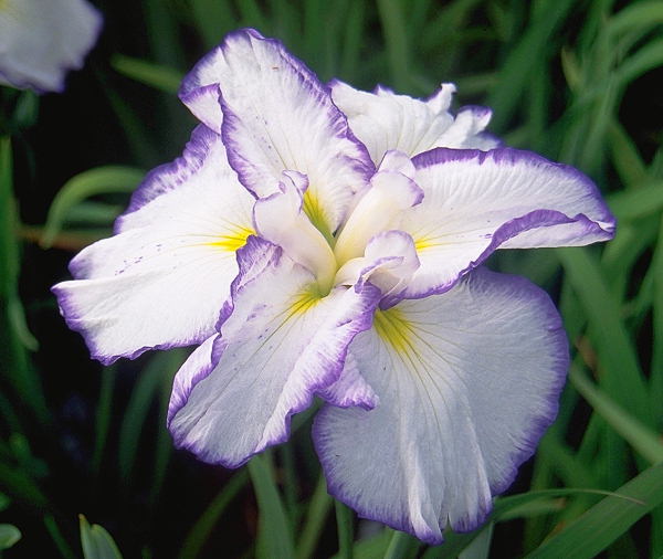 肥後系 中生 純白地に紺色の糸覆輪の入る六英咲き。花径は18cm程度の大輪。