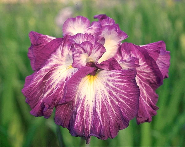 肥後系 晩生 えんじ色に白筋と底白の六英花。花径は約18cmを超える極大輪。