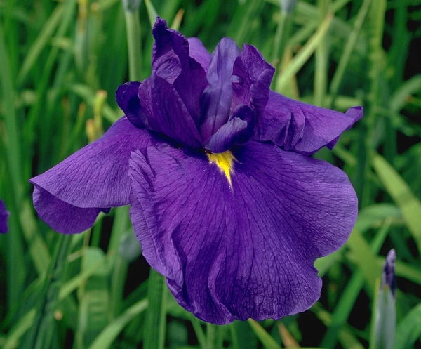 為 朝 ためとも TAMETOMO 肥後系 濃い紺紫の三英花。花径はおよそ18cmからそれ以上になる大輪。 草姿ともに大柄な印象を受ける。 押田成夫氏の作花で、西田信常氏の「水天一色」の後代。水天一色の花柱支は、やや白っぽく、 押田氏はこの点が気に入らなかったようで、この部分が濃い花を作り出し、「為 朝」と名付けた。 作出年代は不明だが、氏のほかの作花の年代からすると、1965年頃と思われる。
