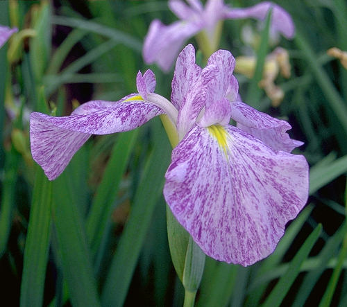 七 夕 たなばた TANABATA 長井古種 白地に紅紫の吹き掛け絞り、三英花。花径はおよそ13cm程度の中輪 で、長井古種としてはやや江戸花菖蒲の面影を感じさせる品種だったと記憶している。 山形県長井市あやめ公園で、近年命名された長井古種の一つ。栽培は少ないと思われる。
