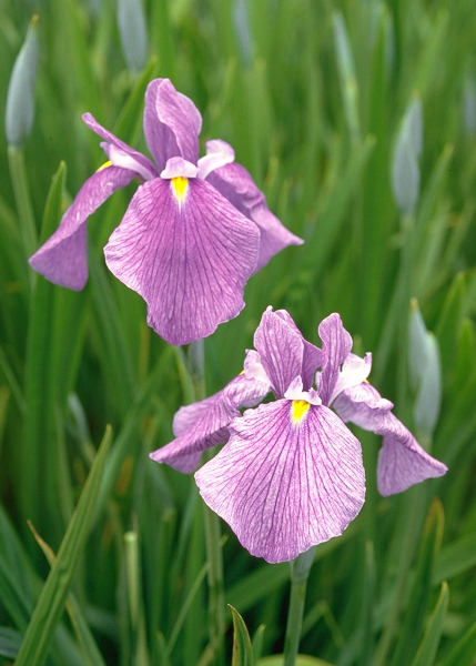 | 辰 野 たつの TATSUNO 江戸系 極早生咲き 白っぽい地色に紅砂子と紅脈が入る三英花。花径はおよそ12cm程度の小輪。草丈は約60cm。性質、繁殖は普通。 吉江清朗氏が1972年に作出した品種。単純な花容だが、どこかしら郷愁をさそうおだやかな花で、吉江氏の代表的な作品の一つ。 氏は球根ベゴニアやマツモトセンノウなど、さまざまな植物の品種改良を行った育種家で、花菖蒲では、戦前、神奈川県農業試験場に在籍して花菖蒲の品種改良を行った宮沢文吾博士の、大分での早生花菖蒲品種改良の後を継ぎ、1962年頃から改良に着手し、1970年代にかけて多くの極早生系花菖蒲を作出した。これらは「吉江系」と呼ばれた。 氏の作品には、本種や、「霧ケ峰」、「八ヶ岳」、「辰野の青空」、「諏訪御寮」など、氏が住んだ長野県辰野町周辺の地名を名前にした品種が多い。 1980年代頃は、この吉江系の花菖蒲は当園に多く植栽されており、全国各地の花菖蒲園にも出荷されたので、吉江系の品種はよく普及していると思う。しかし最近では、極早生咲きも優良な品種が多く生まれたため、当園では「八ヶ岳」など一部の品種をのぞき、吉江系の品種はあまり植栽しなくなった。 たしかに少し前に比べても花菖蒲は十分発達してきたことは実感としてわかるが、こんなおだやかな花でもよかった昔を懐かしく感じる。「最近の花は騒々しくて飽きが来る。」と、協会の理事さん連中が話していたが、その言葉も頷けるような気がする。 |
