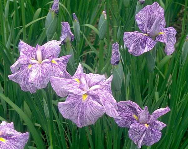 江戸系 極早生 紫に鮮明な白の吹き掛け絞りの三英花。花径はおよそ15cm程度の中輪。