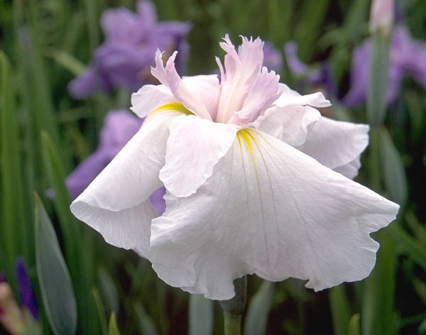 薄化粧 うすげしょう USUGESHO 伊勢系 ごく薄い桃色に薄紅の脈が少し入る三英花。花径はおよそ14cm前後の中輪。 伊勢系の古花の一つで、垂れ咲きの花弁とともに、「蜘蛛手」(くもで)と呼ばれる、伊勢系 独特の雌蕊先端の切れ込みがよく発達した花である。染色体数2n=25の異数体で、繁殖 は良くない。伊勢古花の名花の一つ。栽培は希。 伊勢花菖蒲の古花は、三重県松阪市の松阪三珍花会で保存されている。