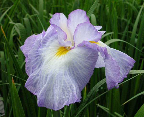 肥後系 白地に藤紫の大覆輪の入る三英花。花径は15cmを越す大輪。