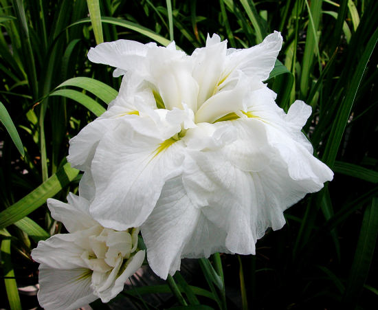 江戸系 純白で、多蕊の特徴的な八重の花を咲かせる平咲き。